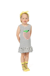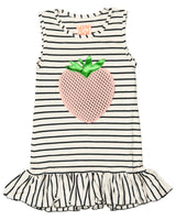 WAUW CAPOW by Bangbang Roberta is a sleeveless black and white striped dress, with a ruffle at the bottom. The dress has a light pink strawberry with shiny green leaves, on the front. The strawberry has a soft mesh like texture that is pleasant to touch. Bring home the smiles you deserve with this cute and simple summer dress, perfect for any occasion. Agnes is wearing the Yum Yum socks, looking extra cute:)