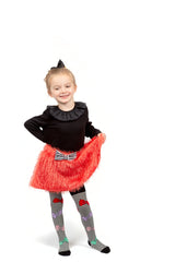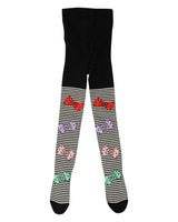 WAUW CAPOW by Bangbang Multi Bow, is a pair of black tights with feet, featuring white stripes on both legs and multiple colorful bows. The bows are woven and not attached to the tights. These tights are for that little something extra playful and fun, to add to an outfit. The cotton in these tights are organic.