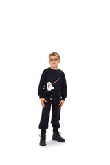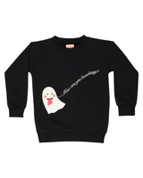 “…How are you boohing?”  Our cute and friendly ghost is back and is just loving the colder weather. Sitting on our soft sweatshirt in the new black version, it almost looks like it's flying through the night out for adventure. Oh! and don't worry, he's very friendly.