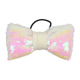 A pink/white hair elastic, with a beautiful big padded bow attached. The hair bow is covered I sequins, which are both white and pink. If you love a matching outfit, we recommend pairing this hair bow with our Bird Girl Frill White dress, which is covered in the same beautiful sequins.