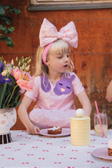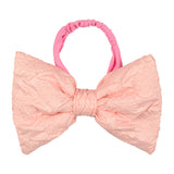 Our pink Olga headband is a statement piece, for sure. The band is made in a soft organic cotton/spandex fabric for optimal comfort and the bow is padded and oversize in the most beautiful pink fabric with flowers ‘crinkled’ into the fabric. If you are looking for more items in this fabric, we recommend pairing this with our Sleepy Rabbit dress.