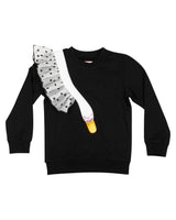 Immerse yourself into our Wauw Capow fairytale and let yourself be hugged by Dreamy, our friendly swan. Dreamy is made of a black dotted light material and is sewn on a black sweatshirt made of organic cotton. Dreamy’s wings will start flapping as soon as you start jumping!