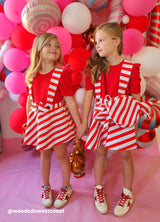 WAUW CAPOW by Bangbang Candy Girl, is a super cute Christmas dress, with a red and white striped skirt with an elastic waistband - and detachable, red and white striped, suspenders. This dress screams Ready-For-Christmas! Alva has matched this dress with the Amina t-shirt, the Nutty tights, the Bon Bon shoulder bag and the Bow Fantastic Xmas hair bow, for an outfit that just says “Christmas is around the corner!”
