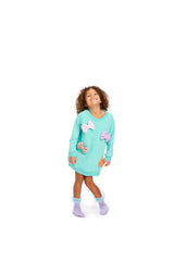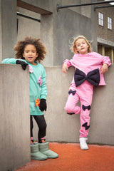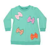 Our Cibby dress is a Mint green sweatshirt dress, made from a comfortable organic cotton fabric. The fabric is brushed on the inside, making it super soft and cosy to wear. We have added different colored bows to the front, for a fun and adorable look.