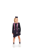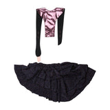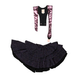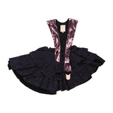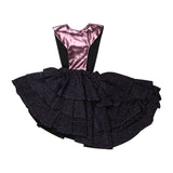 A black and metallic pink dress with a soft cotton lining. The skirt is tiered with ruffles and made in a soft black shimmery metallic fabric. The straps are made from a metallic pink and has a swan at the end. The straps are adjustable and can be totally removed for a new look.