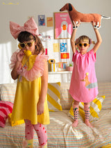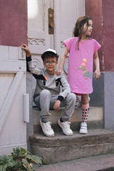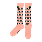Soft pink knee socks with a black and white dachshund. Made from a soft organic cotton.