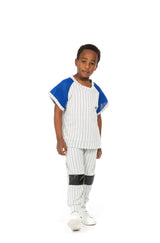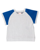 WAUW CAPOW by Bangbang Carl, is a grey T-shirt with narrow black stripes. The t-shirt has some cool blue sleeves, in a mesh-like fabric, with small holes that gives the sleeve a semi see-through look. This is a very cool and simple T-shirt with sporty vibes, reminiscent of baseball jerseys.
