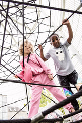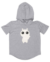 Meet Buddy, the friendly alien we all want to snuggle with. He travelled long and far to find a playmate and after he finally found one Earth, he never stopped playing. Buddy is made out of faux leather and sewn onto a hooded t-shirt.