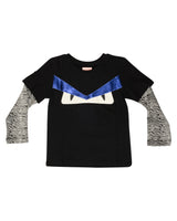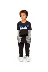 WAUW CAPOW by Bangbang Tom Temper LIMITED is a black t-shirt, with long sleves in a black and white striped zebra-looking fabric. The long sleeve are attached under the t-shirt, going the illusion that it is two shirts. The t-shirt features the eyes Tom - he has a little temper and he might look a little skeptical, but he is pretty cool and quite okay. Toms eyebrows are made from shiny blue material. For a super cool WAUW CAPOW outfit of choice, do as Henry and pair this T-shirt with the Jackson pants.