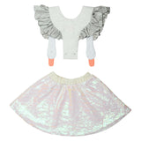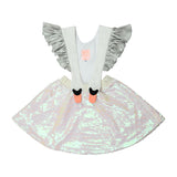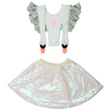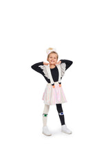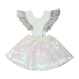 Our bird girl frill white dress is made with an all-covered sequin skirt in a white/pink color. The skirt has an elastic waistband for optimal comfort when wearing this dress. The shoulder straps are made in a white light-padded fabric with shiny silver ruffles attached, creating an illusion of wings. The straps are adjustable and can also be completely removed.