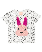 Capri is sewn-on on a polka dot t-shirt and he features furry ears.