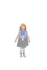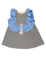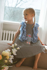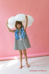 Our adorable chirping dress is back and this time in a beautiful black & white striped version with blue frills attached to each shoulder. The frill looks like wings and once you start jumping around it will look as if you are flying - pretty cute.