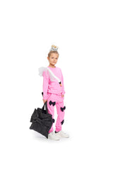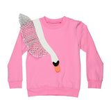 Our Dreamy sweatshirt is always a fun addition to an outfit. This version is made in a pink, soft organic cotton fabric with a brushed inside, for a soft fleecy finish, when wearing it. We have added a white swam application with a see-through fabric with black dots as wings. This is a comfortable yet stylish sweatshirt, perfect for the colder nights and seasons.