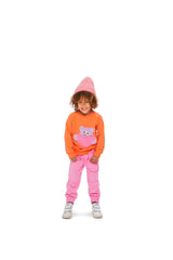 Gigi is a new Wauw Capow friend of the magical forest. She's a cute little teddybear who's holding a pink Heart - she's adorable and we really just want to give her a hug. Gigi sits on the softer orange sweater, which will absolutely both keep you warm and have you look amazing at the same time. You can pair this sweatshirt with anything to add a little wauw magic - but if you are going for an absolute Wauw Capow outfit, we suggest combining this with either our Pancy Fancy pink pants or our Emma mixed pants. It will be Wauwtastic!
