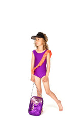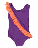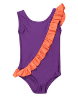Break the waves and build the sandcastle of your dreams in our India one-piece swimsuit! Our activewear collection is perfect for playtime or sports classes! India is our one-piece swimsuit that features a bright purple material accentuated by bright pink ruffles that go across the whole suit. The UV light-filtering capabilities and the fast-drying aspects of the material make this piece perfect for your everyday active look as well!