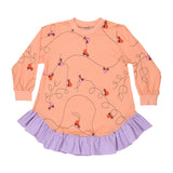 A beautiful long-sleeved dress in coral, with our all-over roller skate print. The dress is made in a super soft organic cotton blend fabric, for the optimal comfort.We have added a purple frill at the bottom, as a cool color contrast application. The dress has a slight A-shape look, for a more relaxed fit.