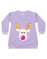 WAUW CAPOW by Bangbang Jingle dress featuring a super soft and furry reindeer on the front. The reindeer has gold antlers and a shiny pink nose. The fabric of the reindeer is made from fake fur and is so soft that you just want to cuddle it. This is an adorable and comfy dress, perfect for those cold winter days!.