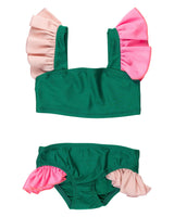 Break waves and have fun at the beach in our Loretta bikini. This season we brought it back in a gorgeous deep green color with both bright pink and soft pink ruffle details on both the top and bottom. This is a WAUW favorite as the fit is amazing and the fabric I soft. And you know we can't resit a beautiful ruffle for that extra Wauw magic.  The UV light-filtering capabilities and the fast-drying aspects of the material also make this piece perfect for your everyday active look as well!