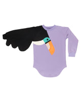 For our love bird dress, it actually looks like you have a big beautiful Tucan on your arm. The sleeve looks like a big wing and the head of the bird is gently sitting on your chest. And not to forget the beautiful color combination of the purple dress and the vibrant colors of the Tucan.