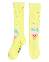 Nice Nina is a pair of beautiful yellow knee socks, with ice cream cones on each socks and filled with colorful sprinkles. These socks will take your mind to a warm summer day in no time as well as put a smile on your face when you take a look at them. The Wauw Capow magic.