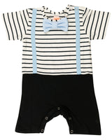 Wauw Capow by Bangbang Orlando is a short romper. The bottom part is black and it opens and closes with snap buttons. The top part is black and white striped and has some light blue suspenders and a bowtie. This romper has a relaxed dapper look for your little one.