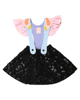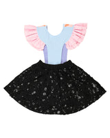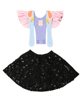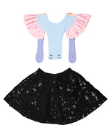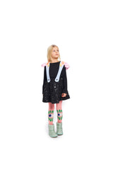 Our Turtle Doves dress is a black and light blue skirt/dress. The skirt has an elastic waistband for maximal comfort when wearing it and it is covered in sequins. The straps are made in a soft light blue fabric with pink crinkled fabric ruffles. We have added pink birds to the straps - two turtle doves. The straps are adjustable and can also be fully removed - making it possible to only wear the skirt or add different straps, form some of our other dresses.