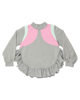 Willa is our more feminine take on a classic sweatshirt. The fit is a little boxy, but gets shorter in the sides and then we added big wonderful ruffle at the bottom, which is just WAUWtastic, if you ask us. And not to mention the color combination of a classic grey melange mixed with the cutest pastel pink and mint. This sweatshirt is definitely a keeper and will be a great addition to your outfit.